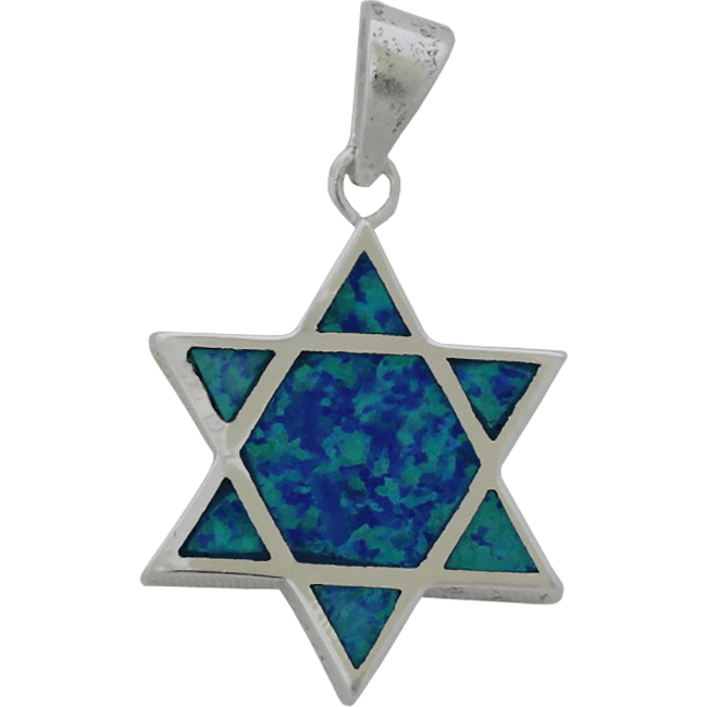 Blue Opal Star of David. Haga una declaración con este colgante de plata esterlina 'Estrella de David' en opal azul / blanco de 2 caras. Este simple y elegante colgante puede resultar un regalo perfecto de Israel. Altura: 0.75 pulgadas / 2 cm