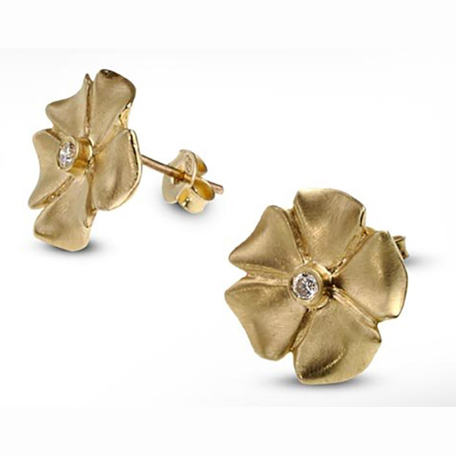 These attractive flower stud earrings will make a great addition to any woman's collection. The a-symmetric flower-petal's design and attention to detail adds a realistic feel to the earrings -- as if an acutal flower has been covered in gold. The petals look so real you just want to touch them! The diamond set in the earring's center adds sparkle and class. The earrings are fastened with classic push closure.