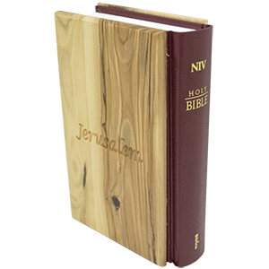 he Holy Bible covered with olive wood from the Galilee embossed with the Tabgha mosaic. This Bible is in the New International Version and available in English only. Approximate Size: 6 1/4 x 4 1/4 x 1 3/4 inches | 16 x 11 x 4.5
