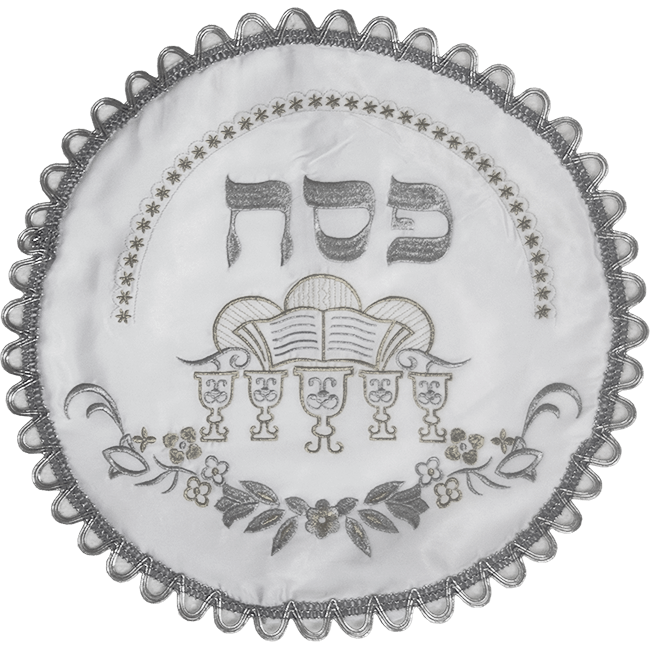 This is used to cover the tradition braided Shabbat bread called Challah. The placement of the challah under the challah cover is to symbolized the double portion of manna, the daily food given by God to the Israelites after the Exodus, that would fall on Friday so they would have enough for Shabbat. This Challah Cover is made white colored satin and decoratively embroidered with silver thread with the Torah scroll, the Shabbat Candles and the wine with Kiddush cup, all used in the blessing of Shabbat. It is written Shabbat The Good Day in Hebrew at the center.
