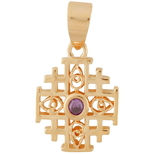 Jerusalem Cross with gold-filled decorative elements on the central cross and a genuine Purple Amethyst in the middle to symbolize the sacrifice of Jesus Christ. Dimensions: 1/2 x 1/2 inch | 1.3 cm x 1.3 cm