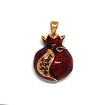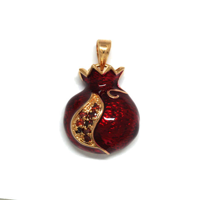 By Israeli Jewelry Designer Marina As one of the Biblical Seven Species of Israel the pomegranate represents abundance, virtue and health. The image of the pomegranate appears throughout the Bible as decoration of the High Priest's robes and they adorned the top of the columns of King Solomon's Temple. This beautiful fruit translates very well into inspirational items. This pomegranate pendant is gold filled with red enamel and set with garnets. Combine this pendant with matching earrings ER4142 for the perfect set. Large: 3/4 inch / 2 cmReview this product