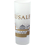 "Jerusalem of Gold" Tall Short Glass. An unforgettable memory from Jerusalem. The glass is partly frosted and on it is the skyline of the city Jerusalem painted in gold. The word Jerusalem is written on the top of the glass in gold. These Israeli souvenirs capture the essence of Israel in a creative manner. Dimensions : 4 X 1.5 Inches / 10 X 4 cm