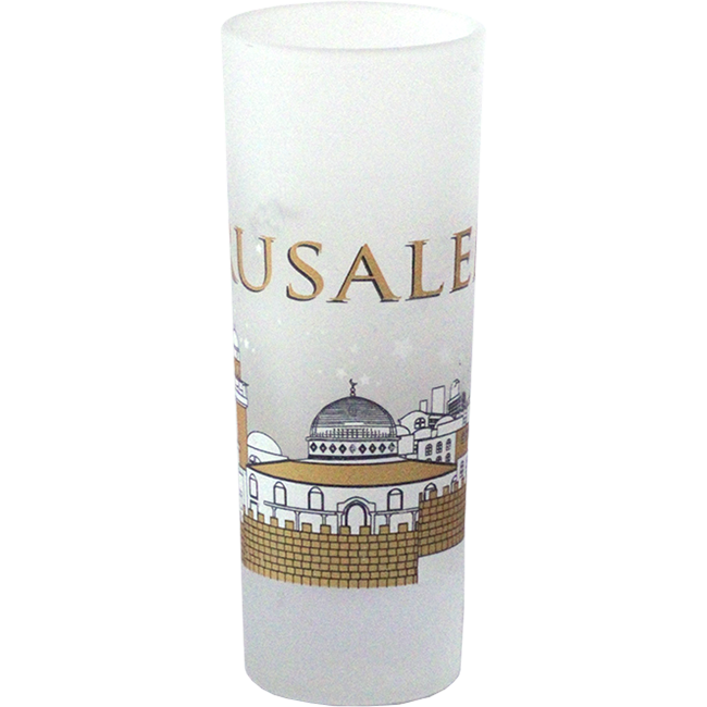 "Jerusalem of Gold" Tall Short Glass. The glass is partly frosted and on it is the skyline of the city Jerusalem painted in gold.