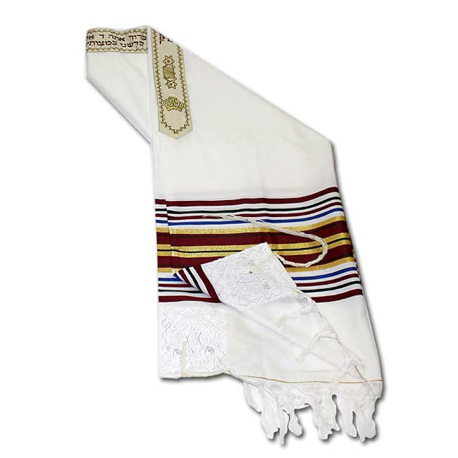 Traditionally designed colorful prayer shawl from Israel. Made of 50% Wool and 50% Acrylic.